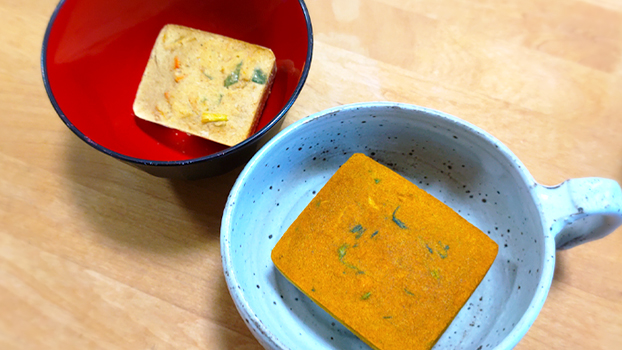 あさげなど、粉末をお湯に解く製品はよくありますが、アマノフーズさんはこんな感じのサクサクしたキューブ型のフリーズドライタイプ。