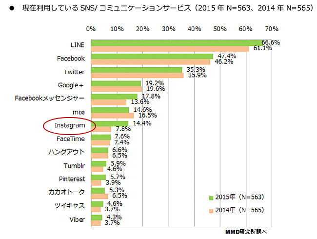 国内では14.4%と、LINE(※コミュニケーションサービス)やFacebookの利用率には届かず、mixiと並ぶといったポジションです。
