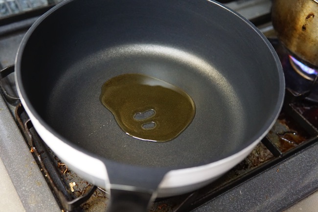 あんを作っていきましょう。フライパンに油をひいて野菜を炒めます。塩コショウで味付けします。