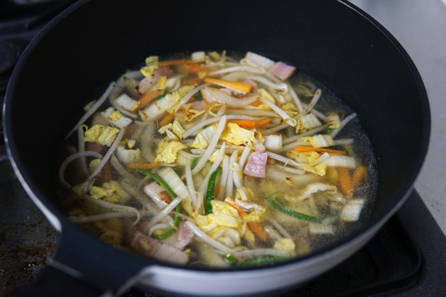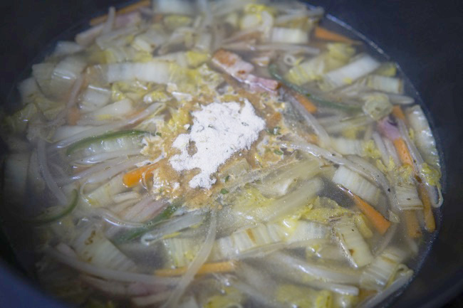 野菜がしんなりしてきたら、うまかっちゃんのスープを入れます。