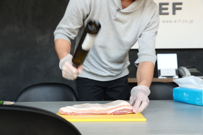 まずは購入してきた「豚バラブロック」に勢いよくフォークで穴を開けていきます。