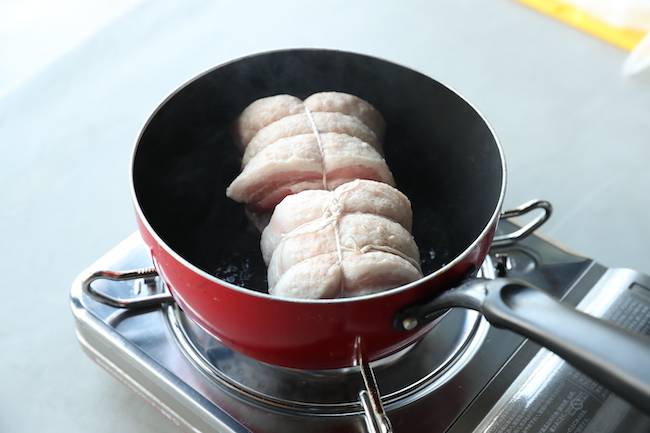 お湯を沸騰させて、弱火を保ったままお肉を1時間下ゆでしていきます。