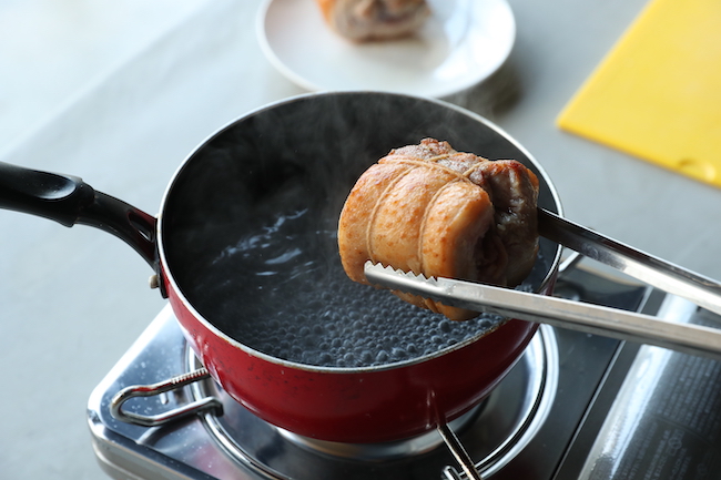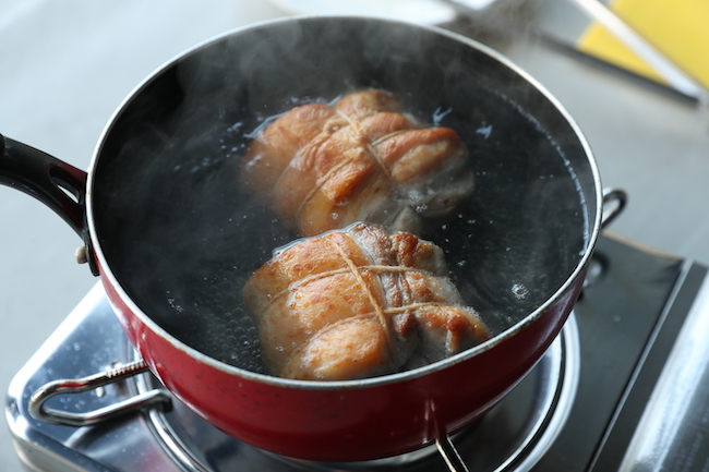 水が蒸発していくので、定期的にお湯を足しながら様子を見てくださいね。火は絶対に弱火をキープしてください。火が強いとお肉が硬くなるので要注意。