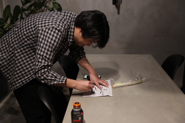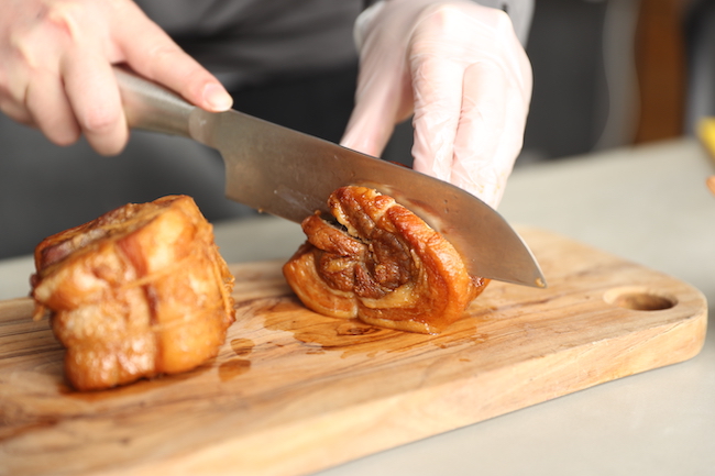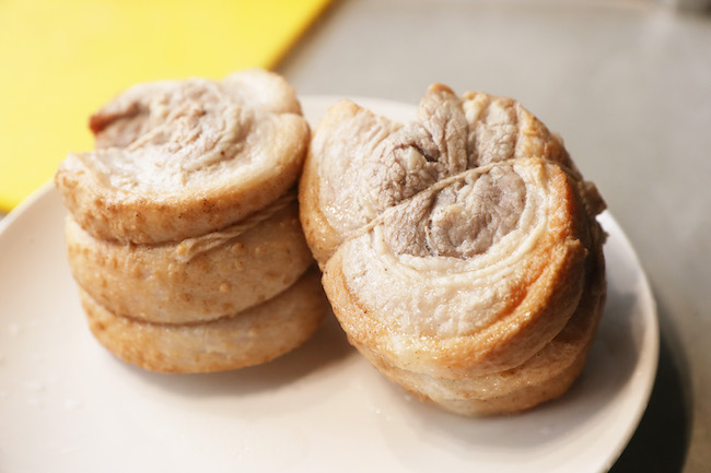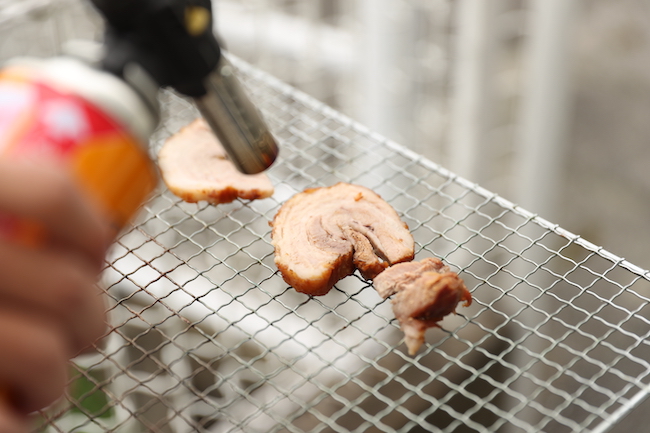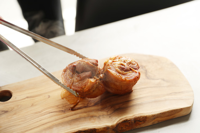 この縛り作業は煮込む際の型崩れを抑えるのと同時に、チャーシューのホロっとした塊感を出すための必須作業となっております。
