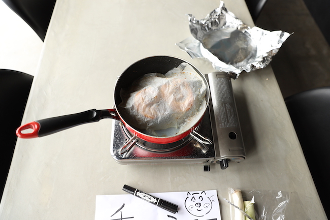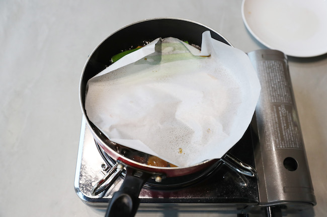 調味料の蒸発を防ぐために、しっかりとクッキングシートで落し蓋をします。