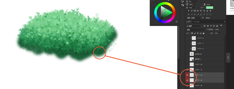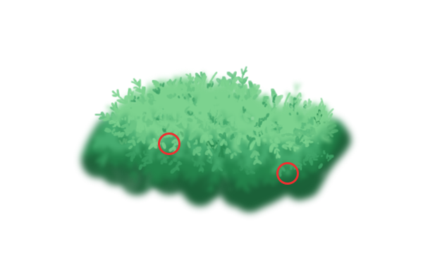 ぼかしているところ(赤丸の所とか)からスポイトで取って葉っぱを描いていくと馴染みやすいです。
