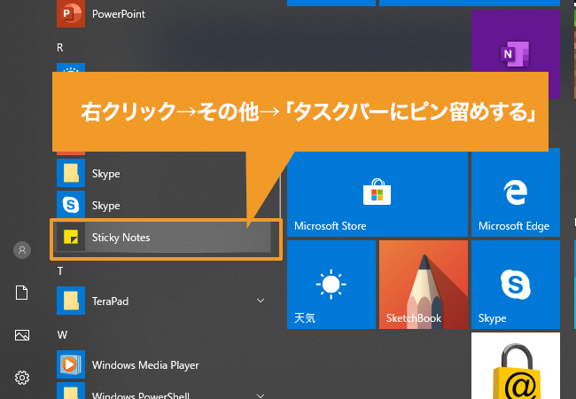 ①まず、スタートボタンを押して、「Sticky Notes」を探します。