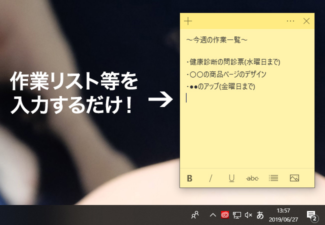 PCを起動すれば、デスクトップにこの付箋アプリが自動的に表示されるので、「あ!これやるの忘れてた!」ということがほぼ無くなりました!