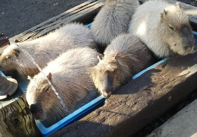 カピバラ温泉には、カピバラたちがみっちり…!癒されます。