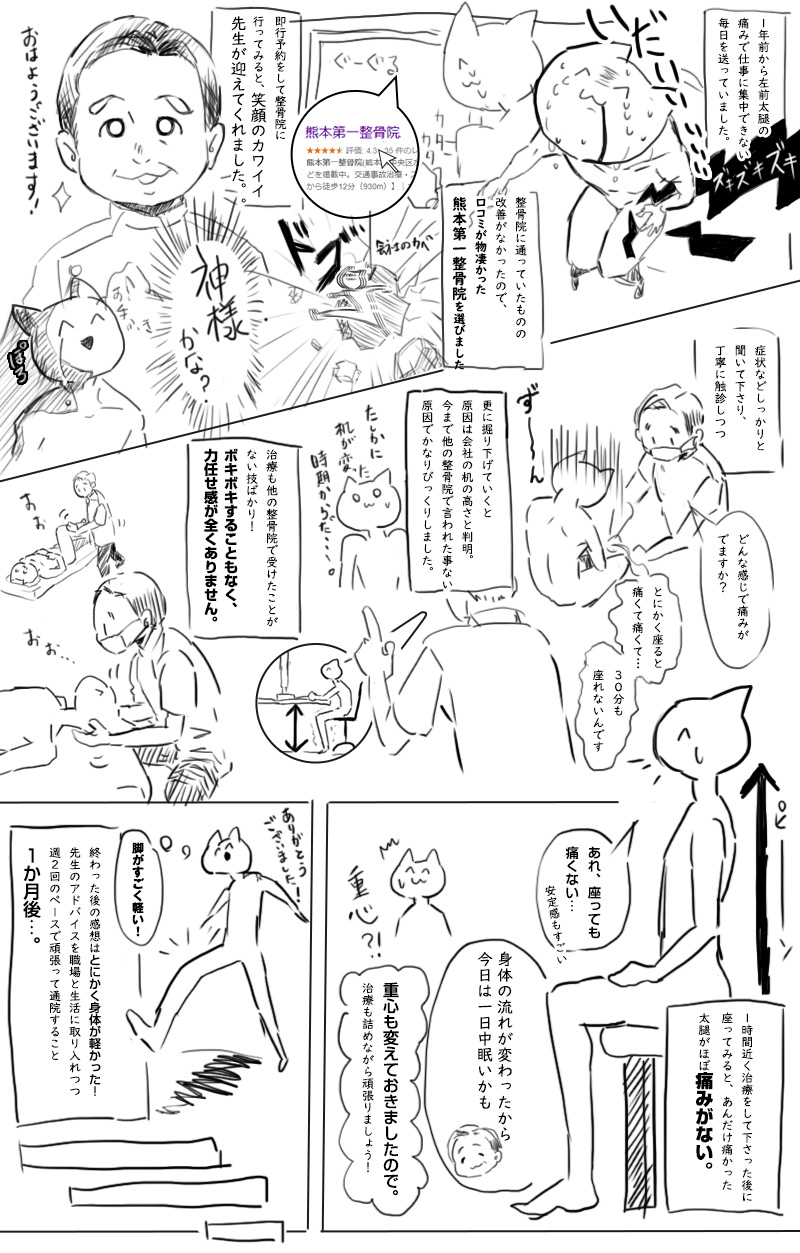 もちろん色んな整骨院にお世話になりましたが、一時的に良くなるものの座ると痛みが出る症状にはあまり改善は見られず。