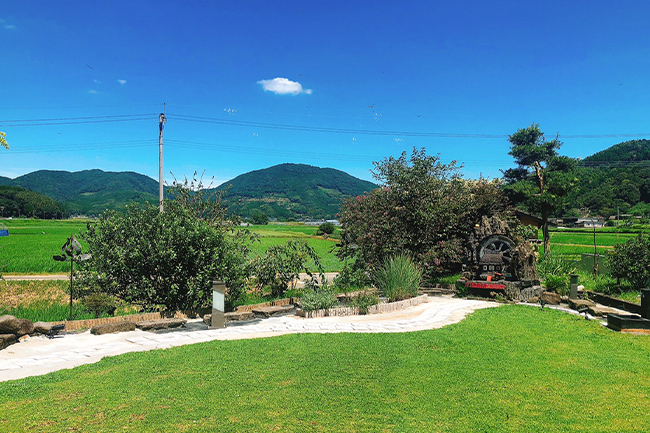 とにかく、整われたお庭とその奥の田園風景がベストマッチしています。