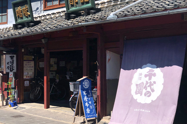 “明治29年創業。江戸時代のメインストリートだった豊前街道と、穀倉地帯における水運を担っていた菊池川が交わるこの地で、元々は米問屋を営んでいました。” 千代の園 酒造より