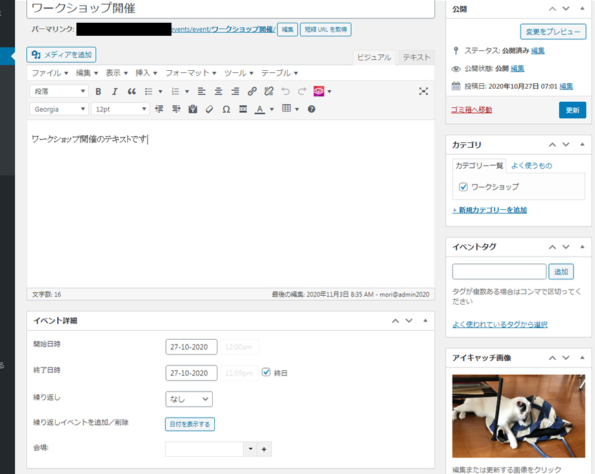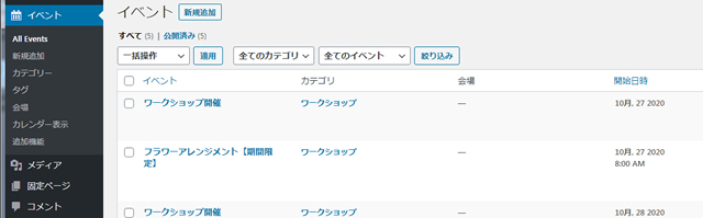 有効化するとこのように「イベント」という投稿機能が追加されます。