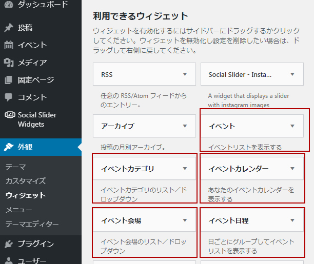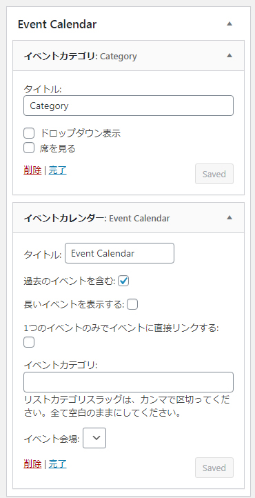 記述後、ウィジェット画面を見ると Event Calendar という枠が出来ているので