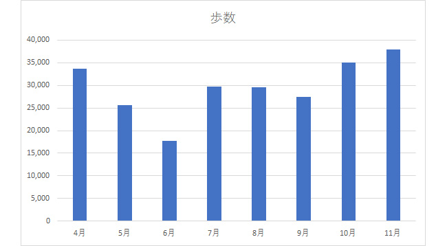 どうしても4月~6月辺りは、緊急事態宣言や雨続きで歩数が少なくなっていますが、10月辺りから、30,000歩以上歩くようになっていますね。