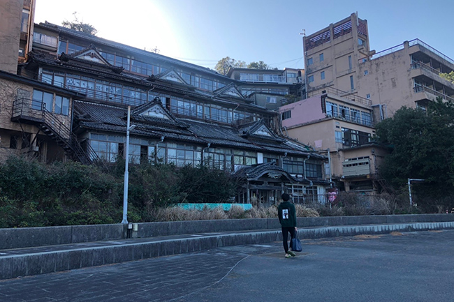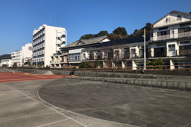 駐車場を降りると湯の児温泉旅館が立ち並ぶ