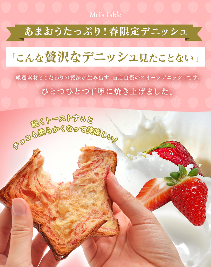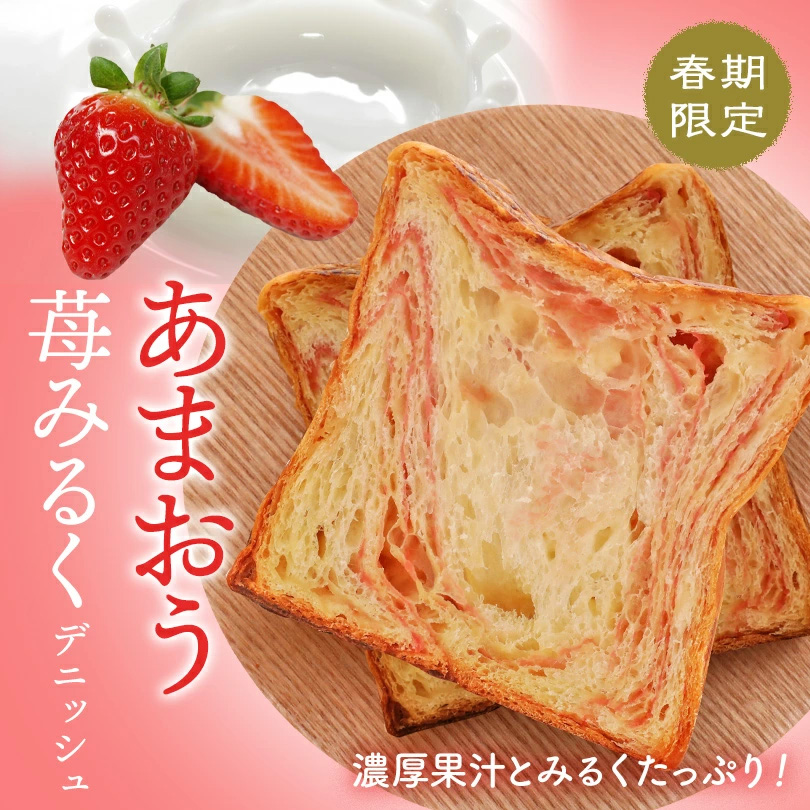 こちらの「あまおう 苺みるくデニッシュ」は、いちごの爽やかさとミルクの優しい甘さがとっても美味しい食パンです!