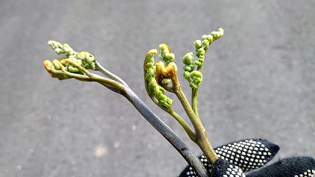 あとは、斜面を登り、崖を降り、野バラのトゲと雑草と戦いながら、ひたすら根気よくわらびを探し続けます。