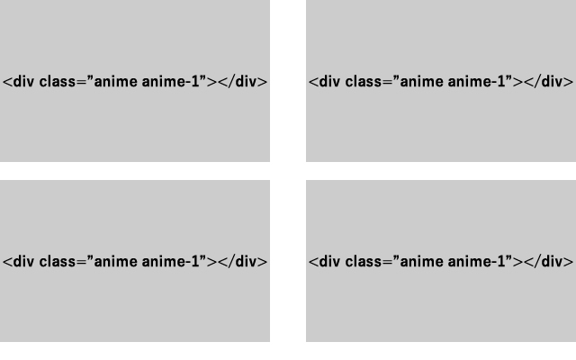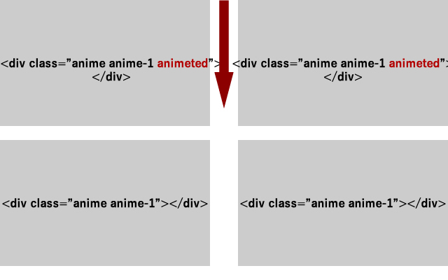 <div class=”anime anime-1″>が見えたころ animated というclassが付与されることになります。