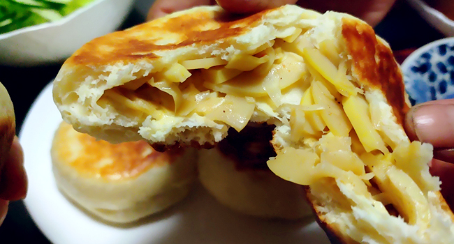 おやきなら具材は無限大ってことで、2回目はサイズを小さくしてチーズの他にタケノコのピリ辛に炒めて詰めてみました(*^^*)