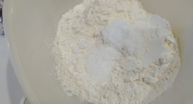 ①書かれている材料(強力粉・イースト・塩・砂糖)を量ってボウルにイン。