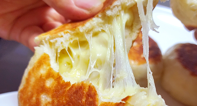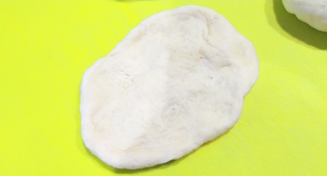 ⑤レンジから取り出して膨らんだパン生地を平たく伸ばしてチーズや具材を包む。