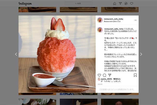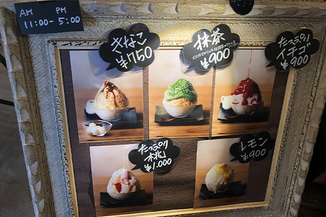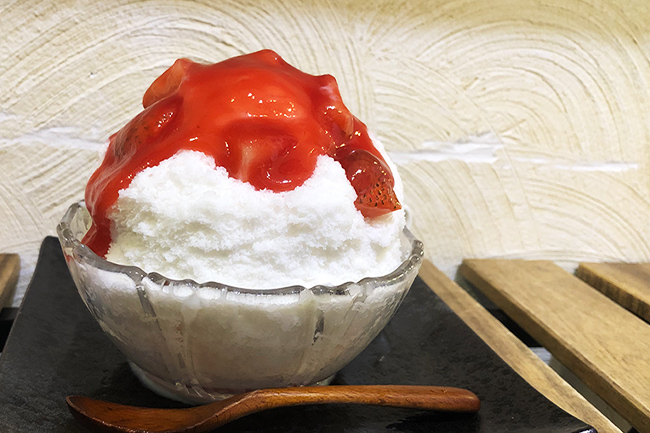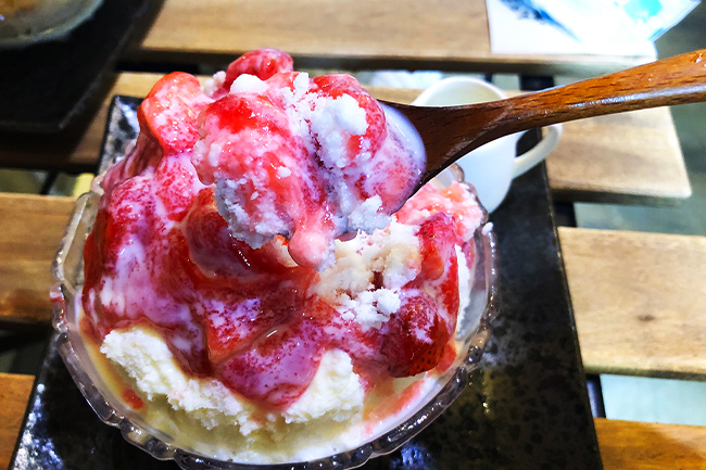 店員さんが目の前で、いちごソースをかき氷にたっぷりとかけてくれます。