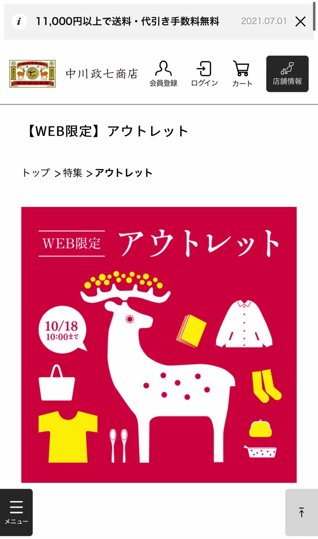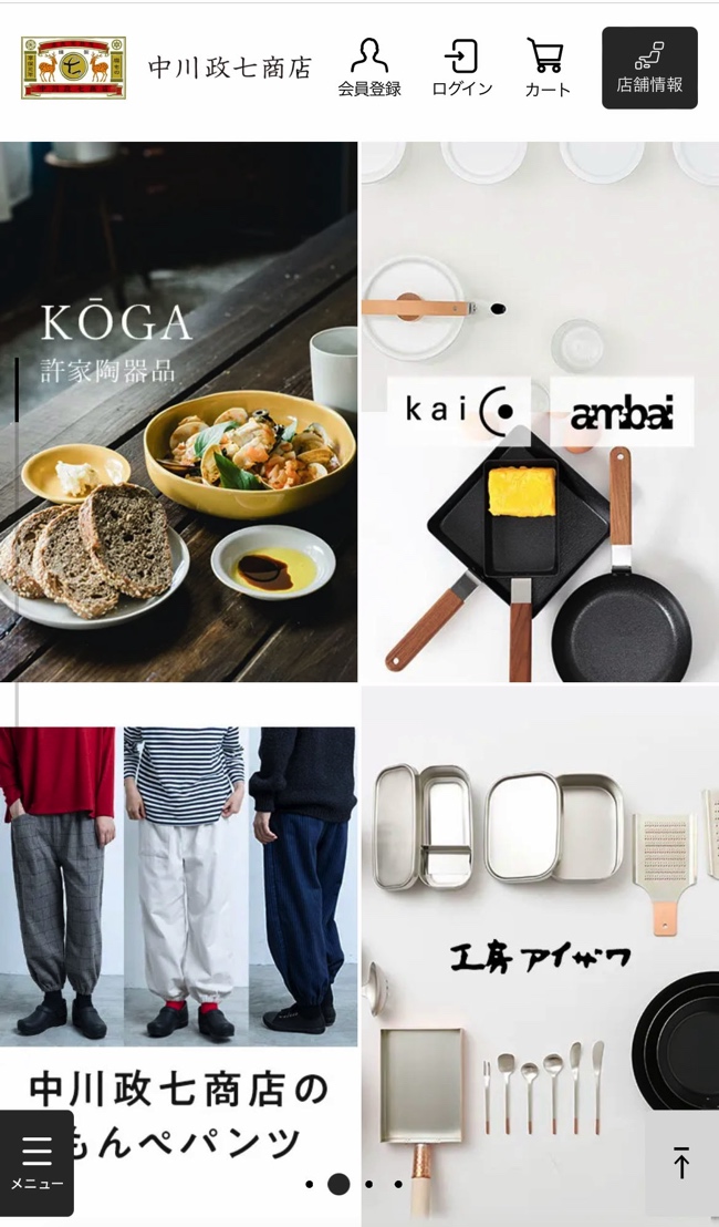 さて、まず「中川政七商店」のスマホサイトに入ると、すばらしいデザインのバナー類が見えてきます。