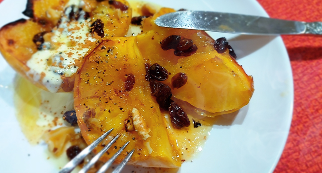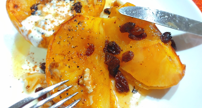 トースターから出したら、皿に盛り付けてレーズンと溶け汁も全部かけて、おい蜂蜜をちょっとかけてブラックペッパーを振ったら完成です。