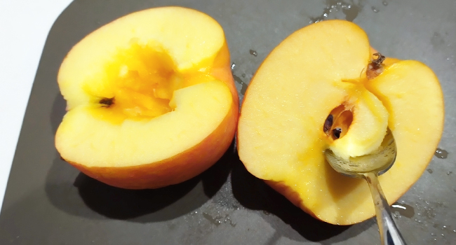 この時、耐熱皿に溶け出た汁を、再度スプーンで果肉にかけ穴に戻しておきます。