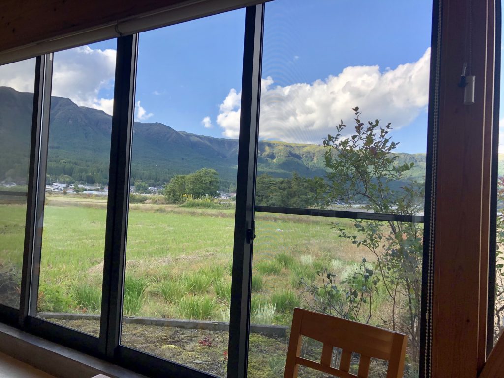 店内は木目調で、大きな窓から見える雄大な阿蘇の山並みがなんとも美しぃ!