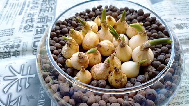 この時期は庭の緑も寂しくなり、室内の観葉植物を愛でているのですが、先日ずっと気になっていた球根花の水耕栽培にも挑戦してみました。