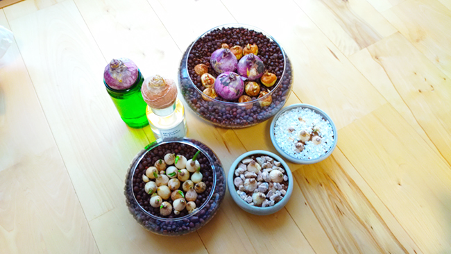 平たい器に寄せ植えする場合も、ビー玉や砂利、ハイドロボール等水耕栽培に適した素材を下にしいて、その植えに球根を置き、球根のすれすれまで水を注げば完了です。
