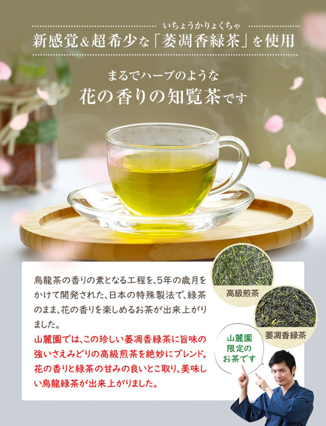こちらの山麓園さんのこちらのお茶は、花の香りが楽しめるちょっと不思議な烏龍緑茶です。