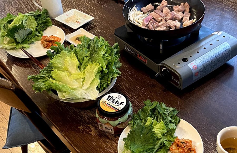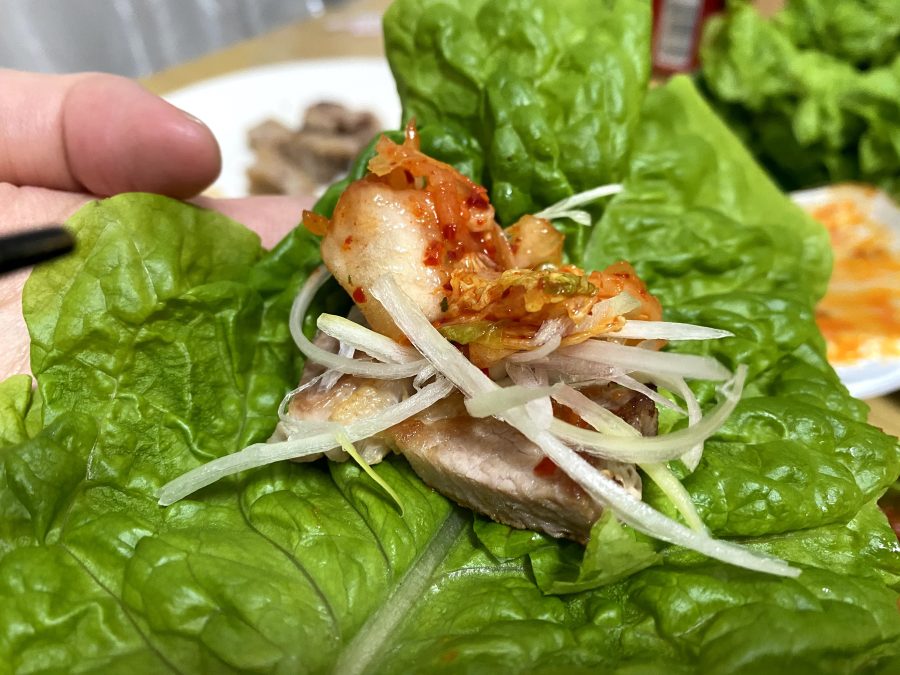 サムギョとは〜〜〜サムギョプサルのこと。感覚的にはサンチュなど葉物に肉やキムチを包んで食べる行為のことを指してます(リコピン的には)