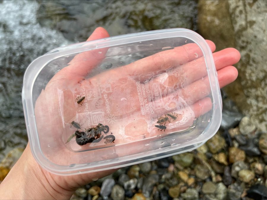 石をひっくり返し、石の裏に引っ付いた子たちを捕まえます