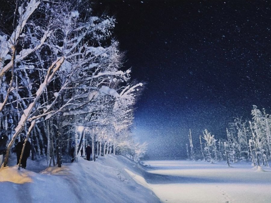 ライトが降っている雪に反射しキラキラしていて