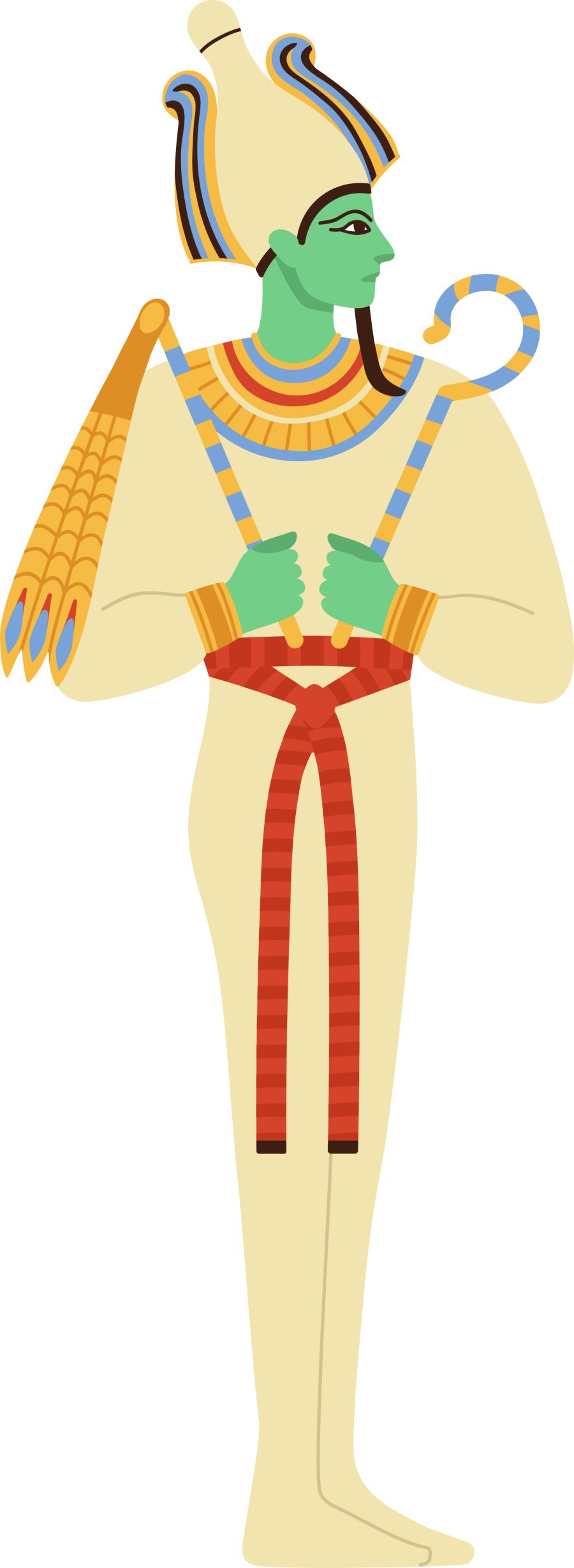 オシリスは、人間の形をした男性の姿で表され、頭には、王冠の一種であるアテフ(Atef)を被り、緑色の肌を持っています。また、彼は、穀物の象徴である麦穂を持っていることが多く、豊穣と再生を象徴しています。