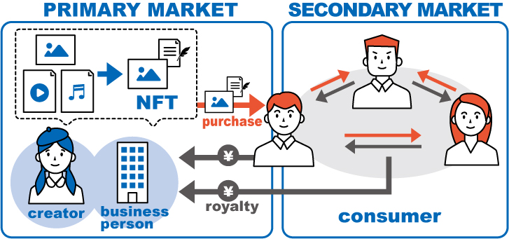 作成者は販売したNFTが売れた場合の利益と二次流通での一部の利益が還元されます。