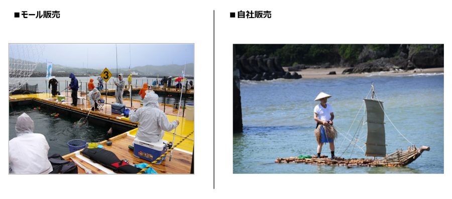 左の写真は釣り堀で漁師さんが魚を釣っている