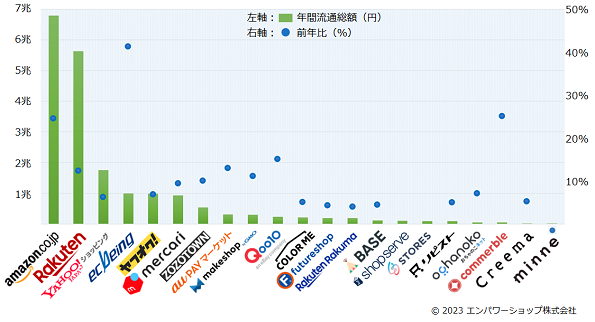 それぞれの流通総額(総取扱高)や出店数、会員数は以下のようになっています。