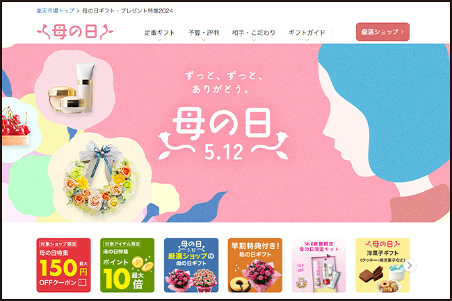 国内主要ECモールの楽天・Yahoo!ショッピングも母の日の特集ページが掲載中!