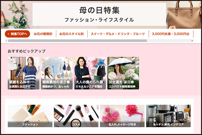 お母さんへ今年のプレゼントを考えられてる方や、競合店がどのような施策をしているか研究したい方は下記に特集ページからどうぞ!!