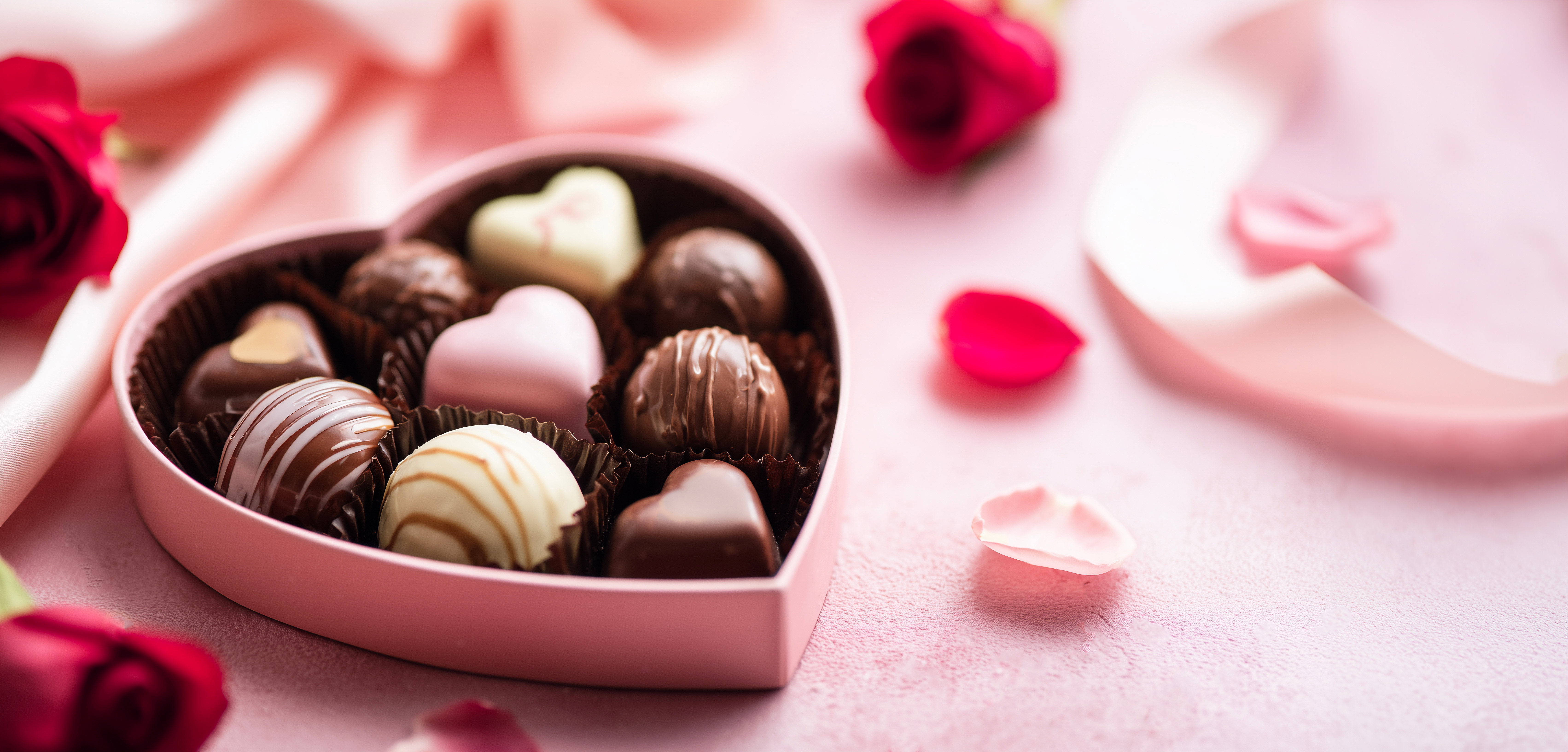 ハートのボックスに並ぶチョコレート詰め合わせと赤いバラ