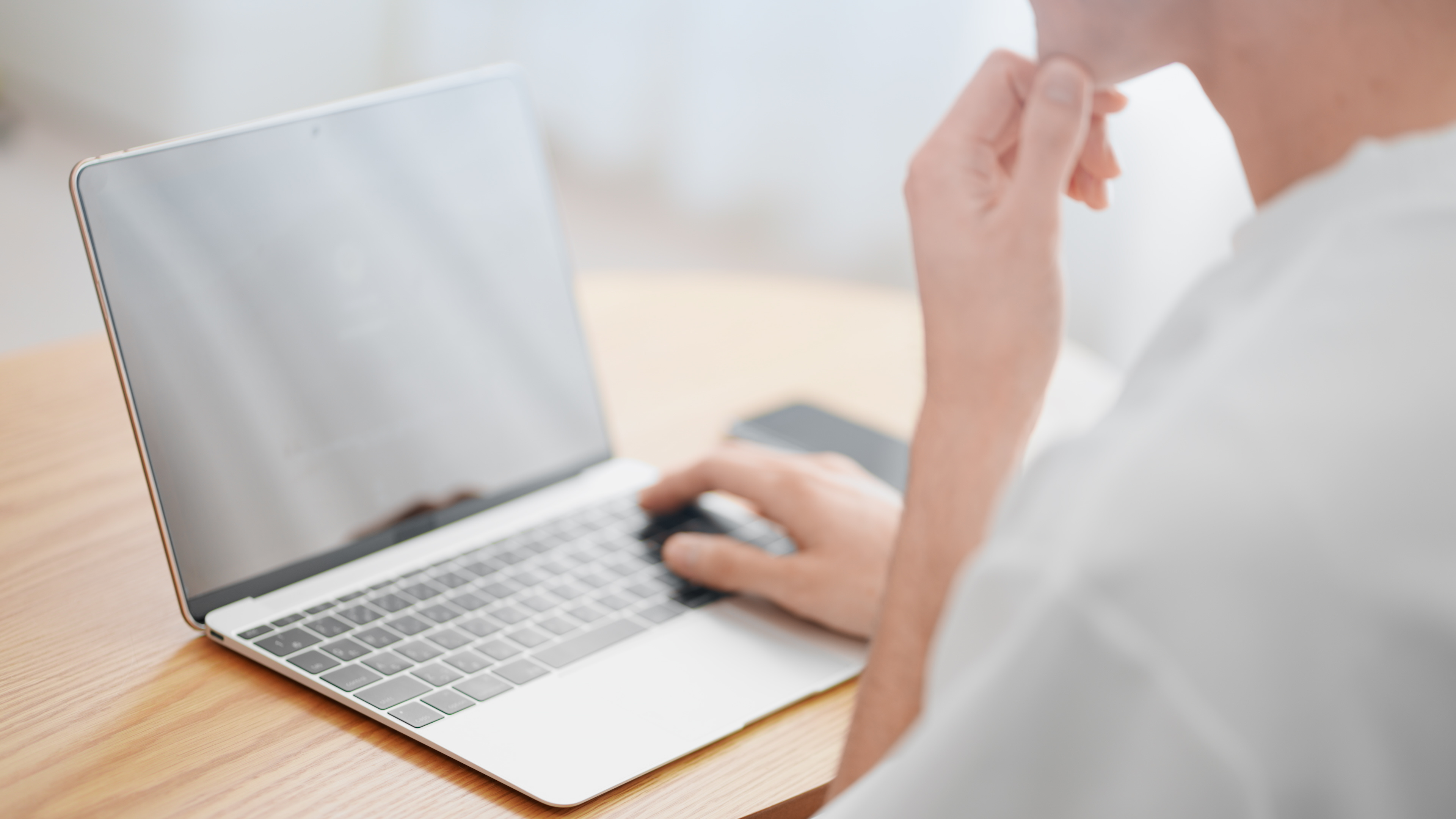悩みながらノートパソコンを使う男性